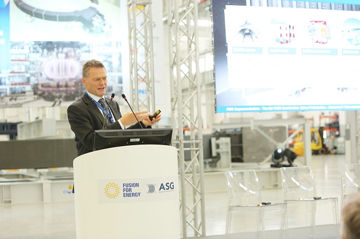 To understand the complexity of the impressive magnet, a technical briefing gathered representatives from F4E and the various consortia involved in the stages of manufacturing. Alessandro Bonito-Oliva, F4E’s Project Manager for Magnets, described Europe’s strategy for the procurement of magnets, its effect in spreading expertise and maintaining a healthy degree of competition between companies. Antonio della Corte, President of ICAS, Italy’s Consortium for Applied Superconductivity, described how ENEA in collaboration with Tratos and Criotec produced the part of the conductor which nestles in the magnet and how this partnership, between a laboratory and two companies, has proved beneficial. Philippe Lazare, CNIM’s CEO for Industrial Systems Division, summarised the work performed by his company and SIMIC vis `a vis the production of the 70 radial plates that protect in their grooves the conductor. The capacity to manufacture large components with extreme accuracy, the investment in infrastructure and new talent were amongst the points that he raised. Stefano Pittaluga, ASG’s Project Manager for ITER magnets, presented the work performed together with Iberdrola Ingenieria y Construcción and Elytt. The sophisticated engineering and tooling for the production of the magnets were presented in detail together with the upgrades that have been performed in the facility. Finally, Paolo Barbero, SIMIC Project Manager for the two contracts that the company has signed with F4E, described the work performed for the production of SIMIC’s share of the radial plates plus the cold tests of the TF coil magnets and their insertion in the cases. Through their narratives, the speakers helped the audience to comprehend how we have converted a conceptual design into a real component and the challenges we have faced along the way.